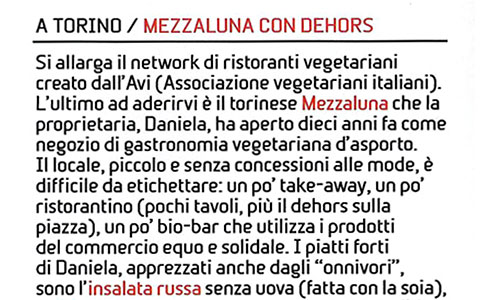 Si allarga il network di ristoranti vegetariani creato dall’Avi (Associazione vegetariani italiani). L’ultimo ad aderirvi è il torinese Mezzaluna che la proprietaria, Daniela, ha aperto dieci anni fa come negozio di gastronomia vegetariana d’asporto. II locale, piccolo e senza concessioni alle mode, è difficile da etichettare: un po’ take-away, un po’ ristorantino (pochi tavoli, più il dehors sulla piazza), un po’ bio-bar che utilizza i prodotti del commercio equo e solidale. I piatti forti di Daniela, apprezzati anche dagli “onnivori”, sono l’insalata russa senza uova (fatta con la soia), la frittata finta (con farina di ceci) e le splendide torte, senza latte né Uova. Tutte le materie prime sono biologiche e di qualità. II resto (grande fantasia e abilità ai fornelli) ce lo mette Daniela.