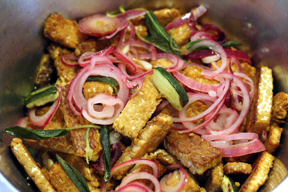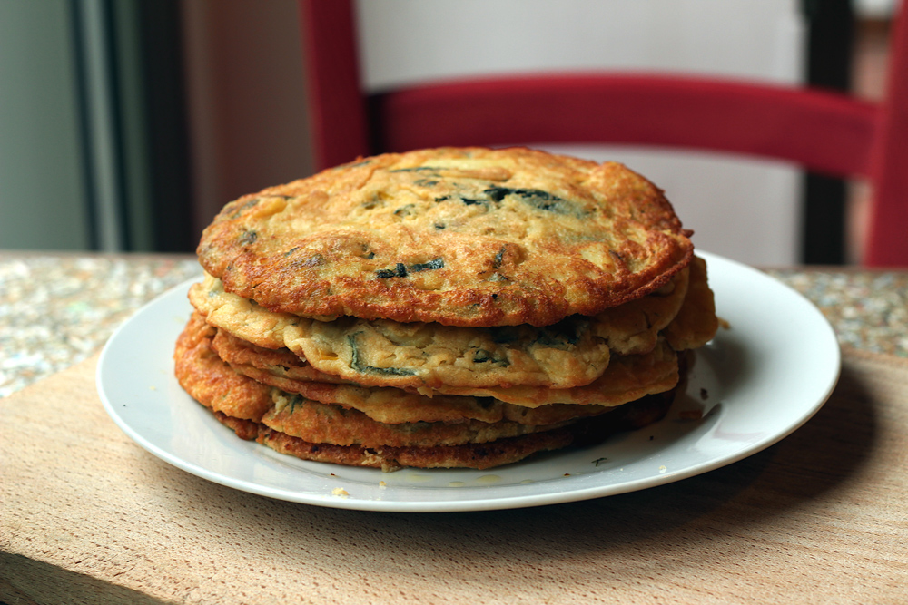 Ingredienti (per 4 persone): 250 g di farina di ceci, 500 ml d’acqua gasata, alga kombu in polvere o kelp (si trova in commercio con uno di questi due nomi), 150 g circa di verdure o erbe cotte di varietà a piacere, olio extra vergine d’oliva, sale marino integrale.